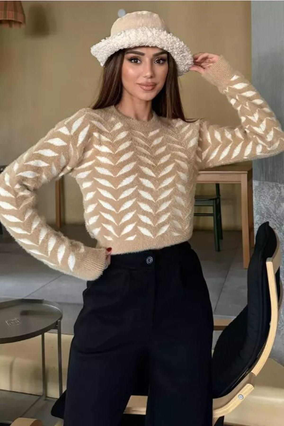 Bisiklet Yaka Desenli Yumoş İplik Croptop Kadın Triko Kazak Bej
