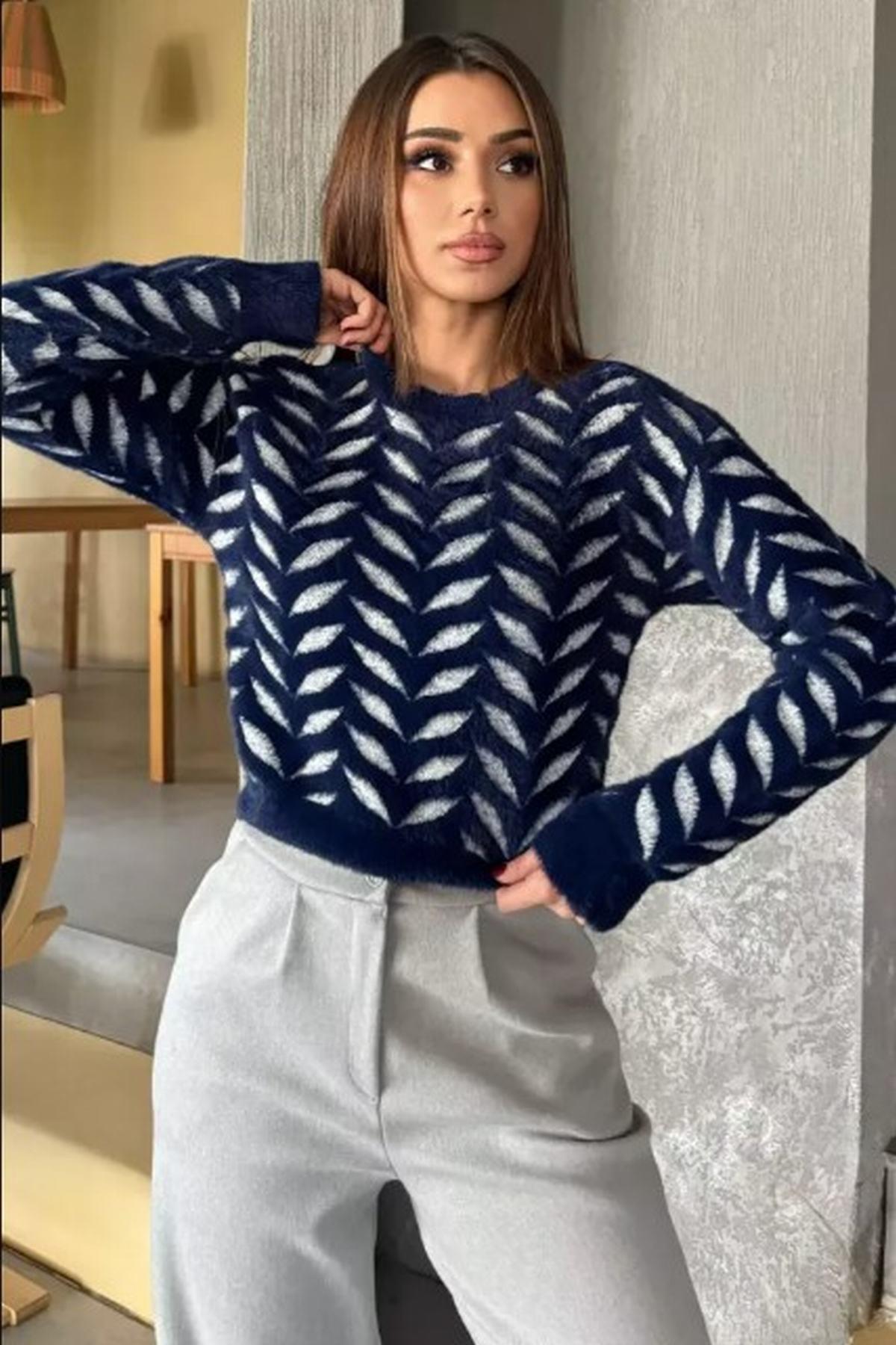 Bisiklet Yaka Desenli Yumoş İplik Croptop Kadın Triko Kazak Lacivert