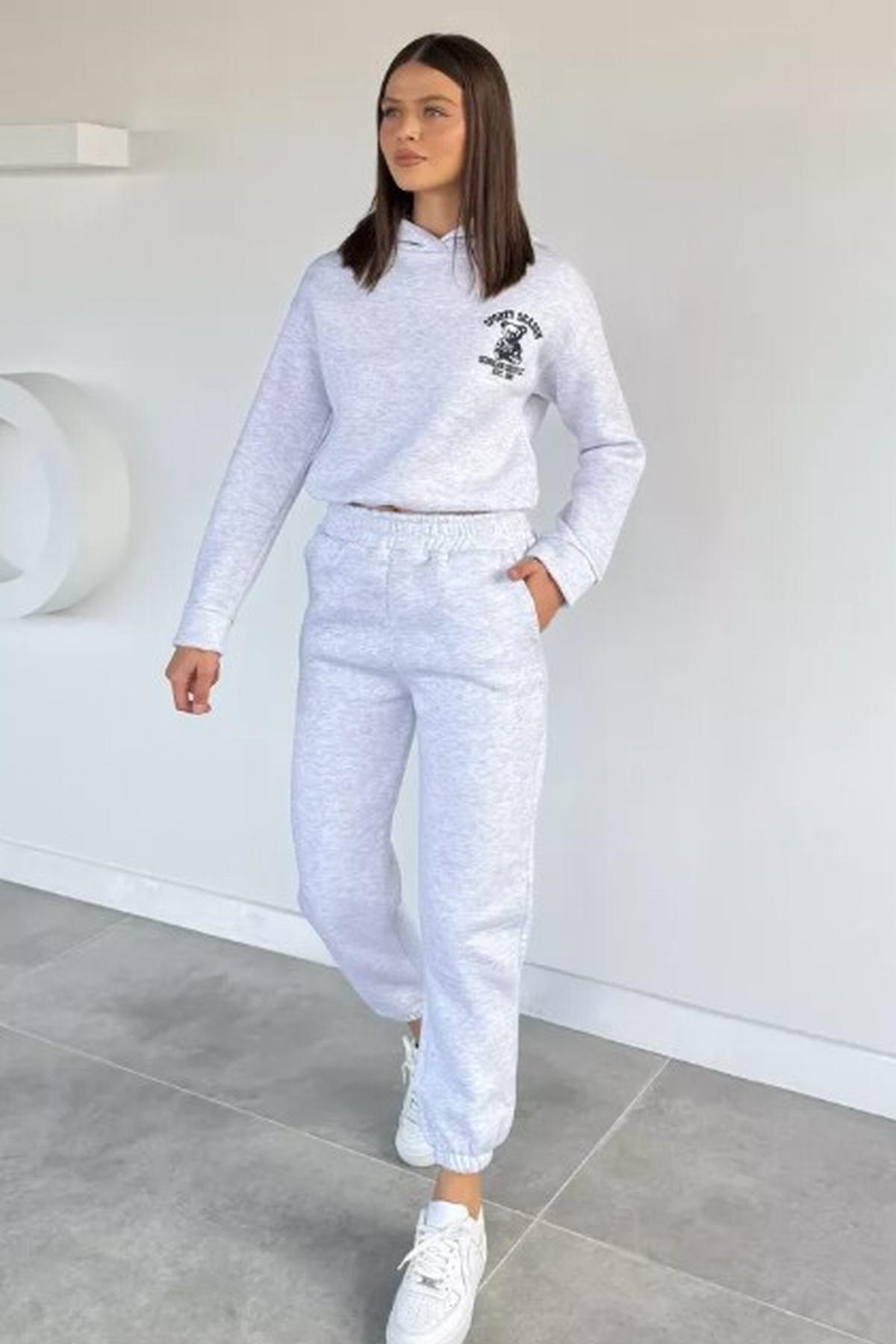 Kadın Kapüşonlu Üç İplik Şardonlu Sweat Eşofman Takımı Gri