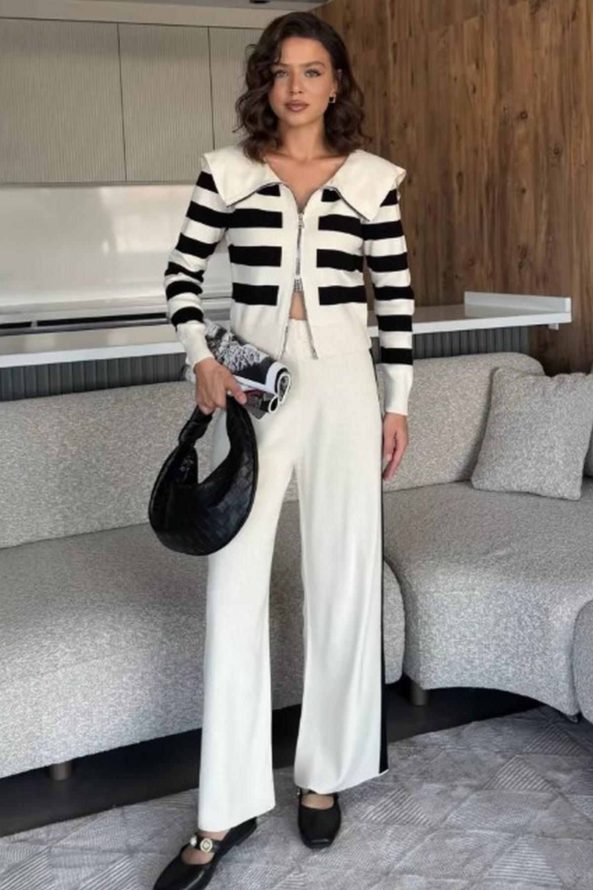 Kadın Şerit Desenli Triko Hırka Pantolon İkili Takım Beyaz