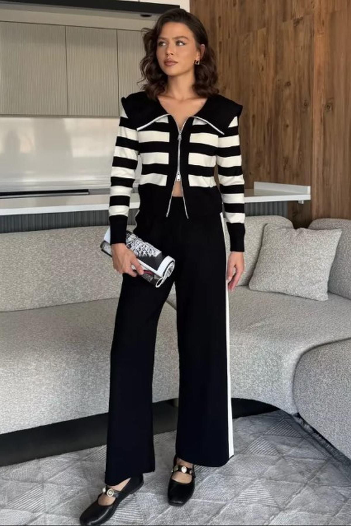 Kadın Şerit Desenli Triko Hırka Pantolon İkili Takım Siyah
