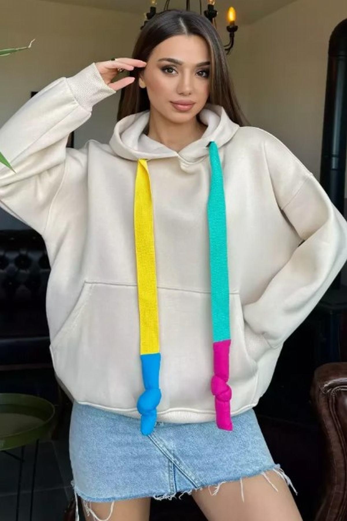 Kapüşonlu Renkli Şeritli Şardonlu Kadın Sweatshirt Bej